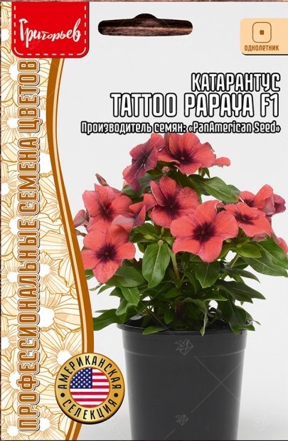 Серия катарантуса «Tattoo»… без сомнения, самая уникальная на рынке в настоящее время! Это новая роскошная линейка барвинка с необычно фантастическими окрасками цветков. Необычные переходы одного цвета в другой. Присутствует эффект люминесцентного свечения лепестков. На каждом цветке оживает искусство Тату: каждый лепесток выглядит так, как будто его нарисовали, нанесли тату черного цвета мягкими мазками кисти. Цветки крупные, многочисленные с перекрывающимися, полностью округлыми лепестками, отображают рисунок тату более выразительно в условиях повышенной температуры, с более низкой освещенностью и в более прохладных условиях цветки выглядят менее выразительно. Обильно цветущий сорт. Растение образует плотный куст с короткими междоузлиями, сильным ветвлением у основания, разрастается в ширину на 50-60 см. Великолепно растет в сухих солнечных условиях и жарком климате, идеально для контейнерного озеленения, в том числе, для подвесных корзин.