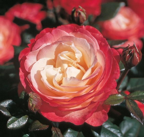 Превосходный сорт считается основателем ностальгического ассортимента садовых роз, разведенных Розен Тантау. Чайно-гибридная роза с крупными, чашевидными, с закрученными шаровидно в центре лепестками, слегка волнистыми крайними лепестками, бело-кремовыми в центре и ярко-вишневыми по краям цветками. Цветки размером 11-12 см. раскрываются медленно , источая во время своего цветения интенсивный, сладкий аромат с нотами малины.
